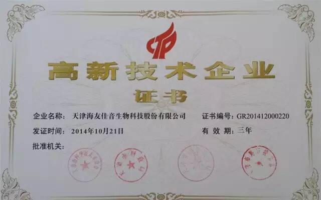 近期,天津海友佳音生物科技股份有限公司被认定为“高新技术企业”,并获得由天津市科学技术委员会、天津市财政局、天津市国家税务局、天津市地方税务局共同授予“高新技术企业证书”。此次获得该殊荣是对公司发展成果的重要肯定,将进一步助推公司提高研发能力。