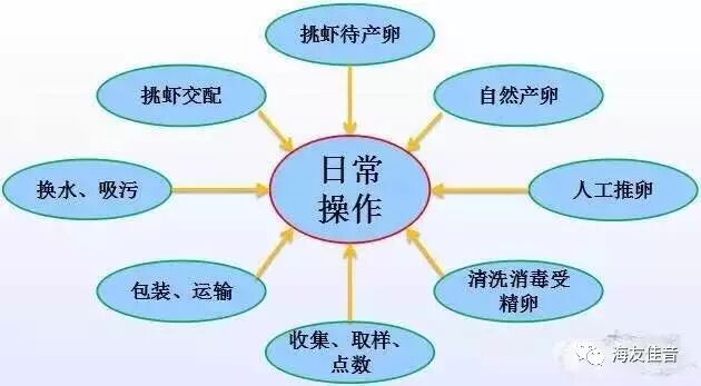 1、日常生产流程:早上8点开始清洁亲虾池(换水、吸污)清洁工作,以及挑选性腺成熟的母虾转移到公虾池自由交配;下午或晚上挑选已交配受精的母虾转移到产卵池等待产卵,一般产卵时间在上半夜,母虾在产卵池产卵后将其转移到母虾池暂养再待生产;受精卵在孵化期间,工人每隔半个小时推卵一次,避免受精卵沉淀在池底,直接影响到孵化率;次日早晨收集受精卵清洗、消毒转移到孵化池进行孵化;次日中午受精卵已孵化成无节幼体,次日下午收集幼体,抽取样品点数,最后打包装运输到虾苗孵化场。